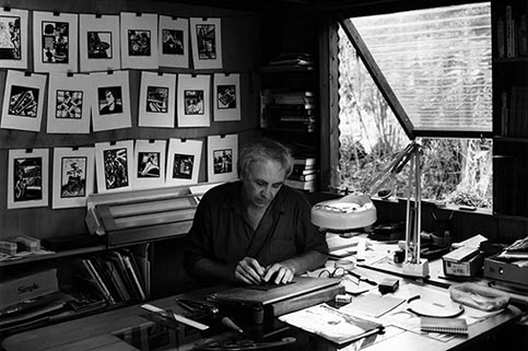 The prints shown here are linocuts. A linocut is a relief print cut in a block of lino such that the areas cut away